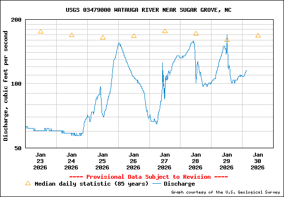 This is a current Watauga River fishing report. Below you will find the most recent stream flow graph, which is a critical piece of information. When you compare the current flow to what is average in history you will see whether the flows are higher or lower than average.